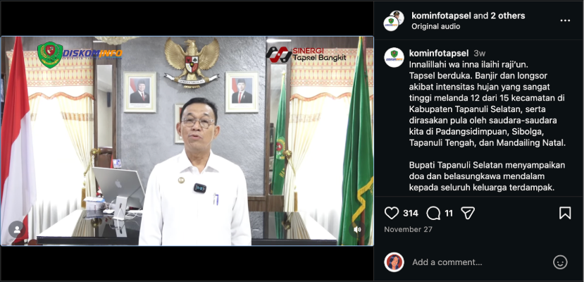 Bahkan setelah tiga hari, narasi visual masih berpusat pada figur pejabat. Wajah presiden, gubernur, dan wali kota terus mendominasi foto dan video. Salah satu unggahan yang menuai kritik luas adalah video bergaya “a day in my life” dari staf presiden yang mendokumentasikan kunjungan ke lokasi bencana dengan iringan lagu pop—lebih mirip konten influencer daripada komunikasi krisis.
