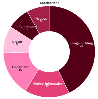 Caption cenderung berpusat pada pejabat, menekankan capaian seperti selesainya kunjungan lokasi atau rapat, alih-alih laporan berbasis korban tentang kebutuhan yang terpenuhi, jumlah penerima bantuan, atau kekurangan yang masih ada.