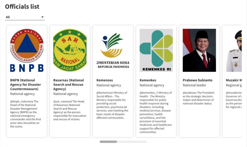 Akun-akun yang dianalisis merupakan milik pejabat dan lembaga yang secara hukum dan struktural bertanggung jawab atas respons bencana di Indonesia, dari tingkat nasional hingga provinsi.