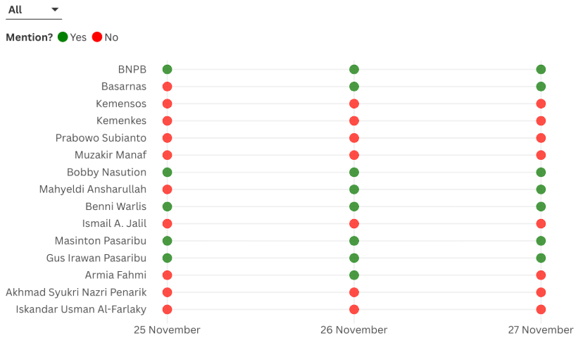 Kementerian Sosial baru mengunggah konten terkait bencana pada 30 November, mengenai distribusi logistik dan dapur umum bagi korban banjir di Aceh, Sumatera Utara, dan Sumatera Barat. Sementara itu, Kementerian Kesehatan hanya memiliki satu unggahan berjudul “Pray for Sumatera” pada 28 November.