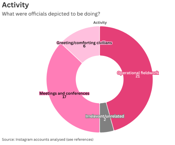 Menariknya, unggahan yang menampilkan aktivitas menyapa atau menenangkan warga sipil secara tidak proporsional menampilkan perempuan dan anak-anak. Pada saat yang sama, sangat sedikit konten yang mendokumentasikan kondisi di dalam lokasi pengungsian atau kunjungan ke lokasi evakuasi selama tiga hari pertama bencana.