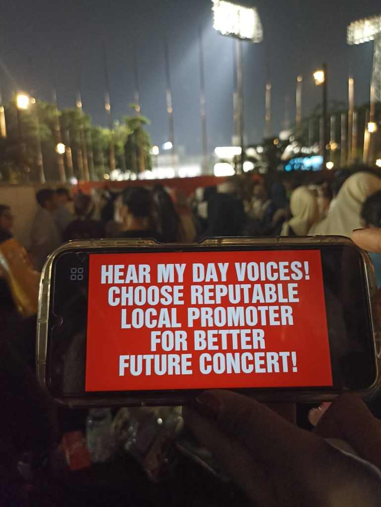 Fiyya, 26, datang ke Stadion Madya GBK pada pukul 16:00. Kedatangannya bukan lagi untuk menonton konser band Korea Selatan favoritnya. Ia datang membawa amarah dan rasa kecewa karena tiketnya tak lagi valid dan mesti dikembalikan. Bersama sahabatnya, Fiyya menuju “section ngemper” – area depan Stadion Madya GBK yang dipadati My Day lain yang senasib dengannya sejak pukul 16:00.