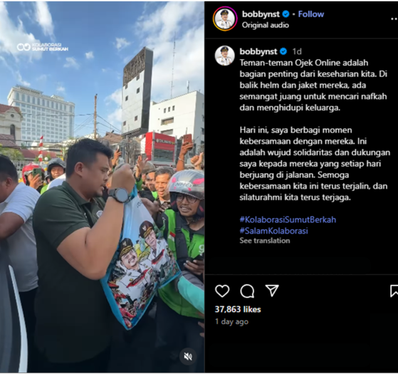 Judul-judul berita seperti “Aksi Spontan Gubernur Sumatera Utara Bagikan Ratusan Paket Sembako ke Ojol” mendominasi media lokal Medan dalam beberapa waktu lalu. Dalam narasi seragam yang tersebar luas, Bobby Nasution—adik ipar Wakil Presiden Gibran Rakabuming—ditampilkan sebagai sosok pemimpin yang merakyat. Gaya ini mengingatkan pada strategi komunikasi politik yang dibangun mertuanya, mantan presiden Joko Widodo.