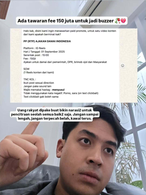 Tak hanya media, ruang digital juga menjadi medan operasi. Influencer populer seperti Jerome Polin membagikan tangkapan layar pesan pribadi yang menawarkan honor hingga Rp150 juta hanya untuk membuat satu unggahan bertema “perdamaian.” Nominal fantastis itu bukan untuk kampanye produk, melainkan untuk membentuk opini.