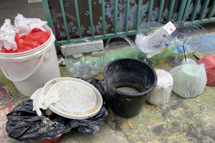 Bahan-bahan yang Edo gunakan dalam menyulap limbah popok antara lain adalah semen, air, dan juga aneka warna cat untuk tahap finishing. Sebelum mencampur sampah popok dengan semen dan air, Edo secara telaten memisahkan dahulu bahan luaran popok dengan kandungan gel yang ada di dalamnya.