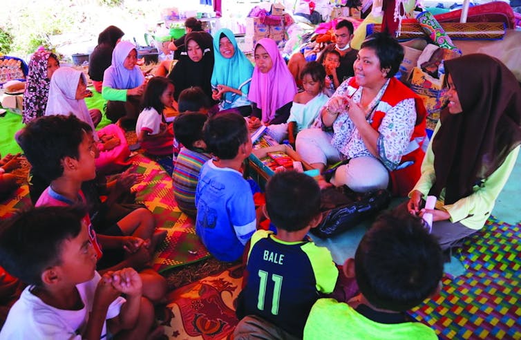Salah satu aktivitas pemulihan trauma pascabencana di Lombok. (Pertamina)