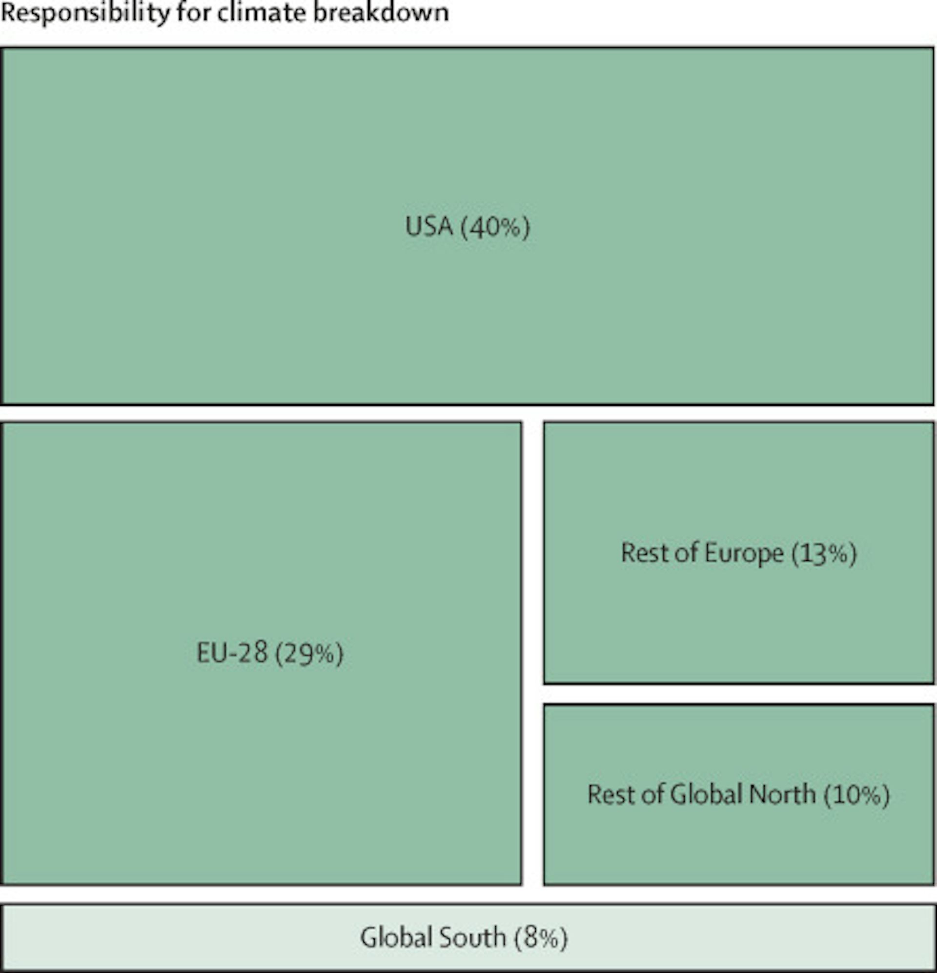 Porsi emisi global selama 1850-1969 menunjukkan negara-negara kaya bertanggung jawab atas kerusakan bumi sejak lebih dari seabad silam. (Jason Hickel/Lancet)