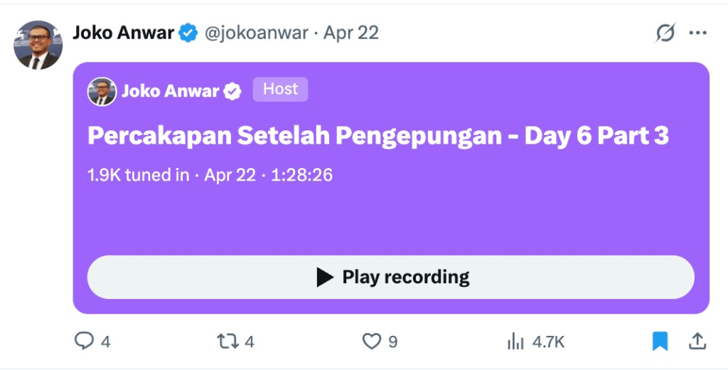 “Kalau ditanya bagaimana agar kita tidak menuju 2027 lewat film ini, tentu kita buat film ini tidak untuk menyelamatkan dunia. Kita buat film ini untuk membuka mata, that’s it,” ucap Joko Anwar di siaran Space ‘Percakapan Setelah Pengepungan’ lewat akun pribadi X-nya (22/4).