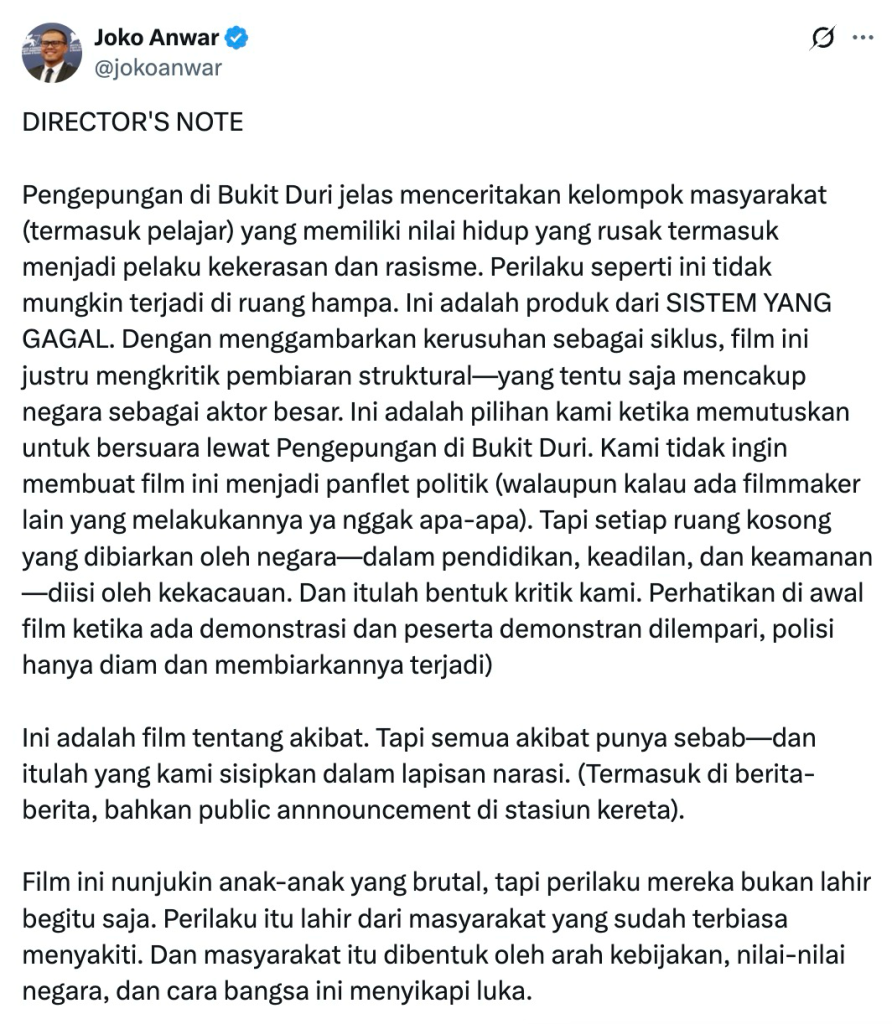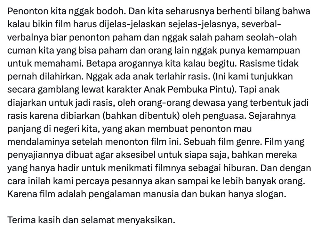 Pada saat posisinya sebagai sutradara digugat, Joko merilis director’s note di akun X-nya yang justru menuntun interpretasi penonton pada bacaan tertentu. Ia menolak didaktisme, menolak menjelaskan “severbal-verbalnya”, tapi juga menyuguhkan banyak informasi visual dan naratif yang cukup eksplisit memperjelas konteks sosial yang ingin disampaikan.