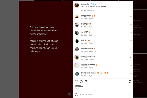 Akun-akun seperti @gerakanpria, @jalan.hidup.seorang.pria, dan @pesan.pria menyebarkan narasi yang berpusat pada luka laki-laki, tapi justru mengarahkannya pada kebencian terhadap perempuan. Inilah bahaya diam-diam yang menghantui orang tua seperti Zaenal.