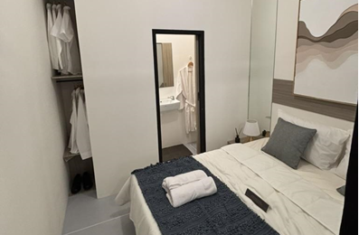 Di ruangan lainnya, terdapat kamar tidur kecil yang langsung terkoneksi ke kamar mandi dan lemari pakaian mini. Saya mencoba membayangkan hidup di dalamnya. Mencuci di dekat kasur. Menyimpan baju di ruang sempit. Duduk dan makan di lantai yang sama tempat menjemur pakaian.