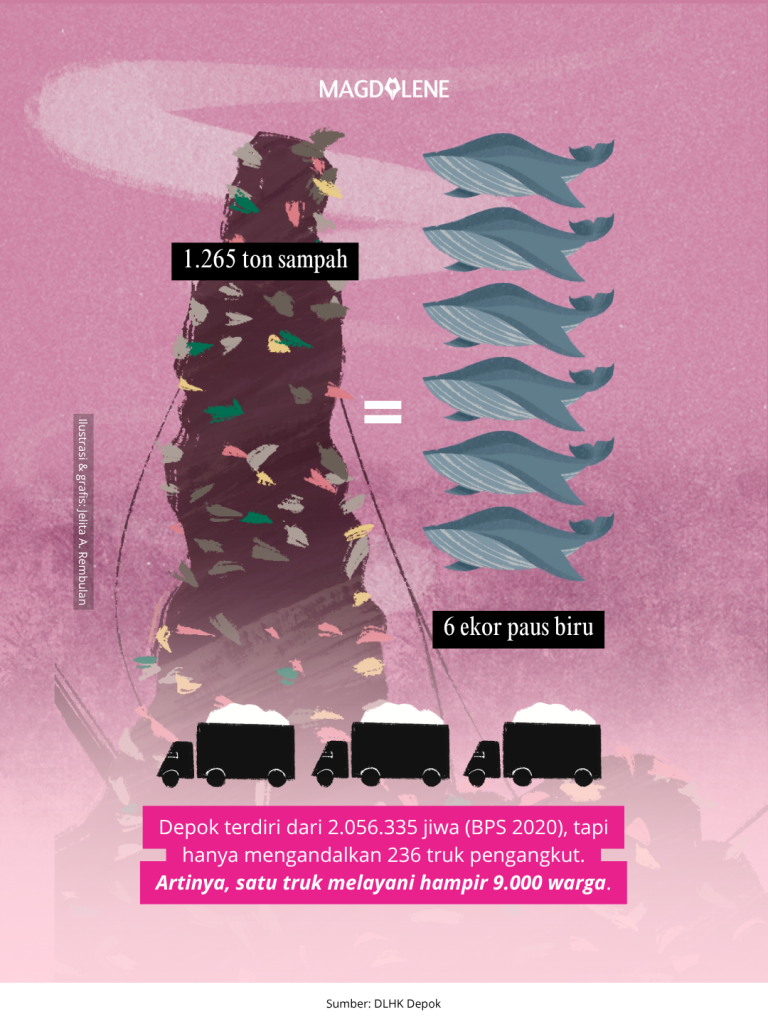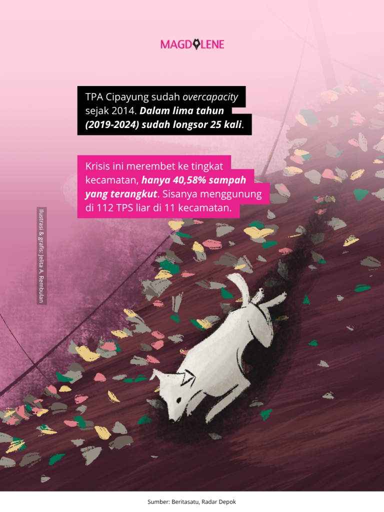 Penutupan TPA Cipayung seperti ini bukan yang pertama. Tempat pembuangan tersebut telah kelebihan kapasitas sejak 2014. Menurut catatan Dinas Lingkungan Hidup dan Kebersihan (DLHK) Kota Depok, hingga kini TPA Cipayung masih menerima lebih dari 1.256 ton sampah per hari—jauh melampaui batas tampungnya. Jumlah ini bahkan setara dengan berat enam ekor paus biru. Tak heran jika beberapa kali terjadi longsoran di sana. Penutupan sementara di sisi lain, cuma penanda kecil dari krisis pengelolaan sampah yang lebih besar dan sistemik.