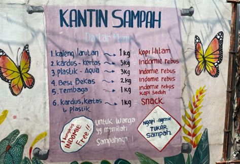 Di tembok rumah warga, mural-mural edukatif menghiasi dinding. Ada gambar anak-anak memungut sampah, ibu-ibu mengaduk kompos, hingga tulisan yang mengajak menjaga lingkungan dari rumah. Di tengah kampung berdiri kantin sampah, tempat warga bisa menukar botol plastik, kardus, dan kemasan sachet dengan sembako atau jajanan buatan tetangga sendiri.
