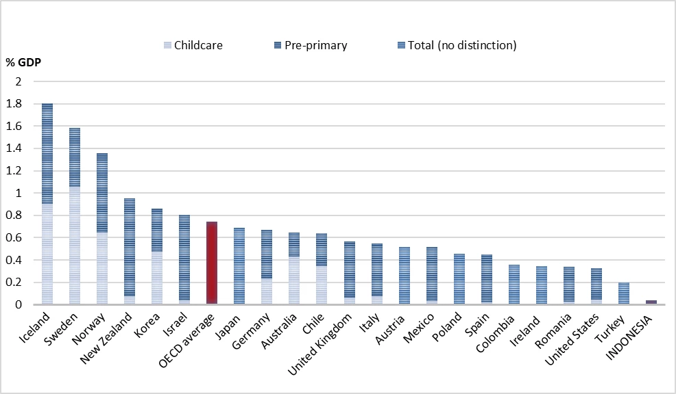 Sayangnya, menurut laporan Organisasi untuk Kerjasama Ekonomi dan Pembangunan (OECD) 2021, sejauh ini anggaran pemerintah Indonesia untuk pengasuhan dan pengembangan anak usia dini hanya sekitar 0,04 persen dari produk domestik bruto (PDB), jauh di bawah rekomendasi OECD sebesar 1 persen dari PDB. Dalam penelusuran Seknas Fitra sendiri berdasarkan data Dapodik misalnya ditemukan jumlah daycare yang dikelola oleh pemerintah hanya 32 daycare, sedangkan daycare yang dikelola oleh swasta berjumlah 2.424.